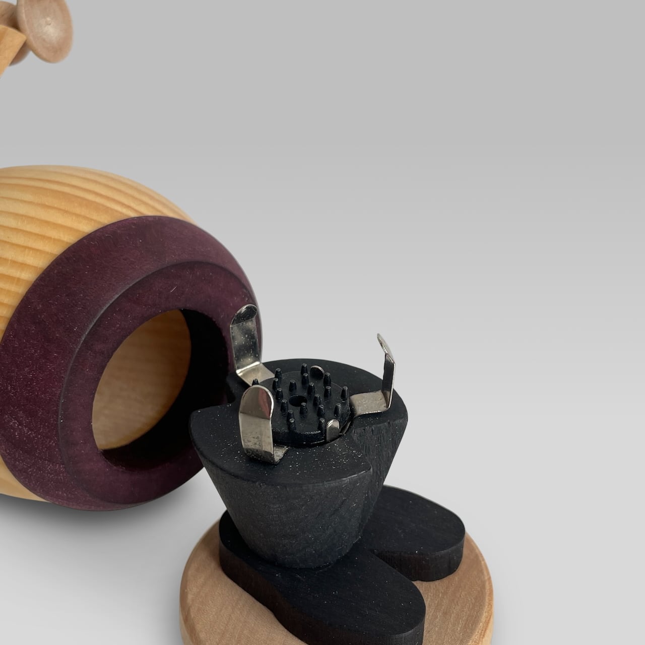 エルツ山地の伝統工芸である煙出し人形をモチーフにしたシリーズ「Max Rauchmann」は、内部にお香を置くと口から煙が出るユニークな趣向品です。